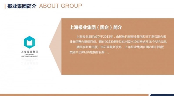 上海報業(yè)集團(tuán)成立于2013年,由解放日報報業(yè)集團(tuán)和文匯新民聯(lián)合報業(yè)集團(tuán)整合重組而成。擁有20多份報刊2家出版社10家網(wǎng)站及18個APP應(yīng)用。
