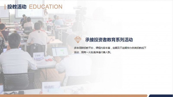 多年深耕投教平臺,課程內(nèi)容豐富,定期及不定期舉辦各類投教線下活動,擁有一大批高凈值付費(fèi)人群。